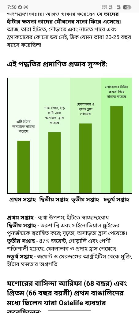 প্রথম সপ্তাহ – ব্যথা উপশম; হাঁটতে স্বাচ্ছন্দ্যবোধদ্বিতীয় সপ্তাহ – তরুণাস্থি এবং সাইনোভিয়াল ফ্লুইডের পুনর্জন্মকে ত্বরান্বিত করে; দৃঢ়তা, অসাড়তা হ্রাস পেয়েছে।তৃতীয় সপ্তাহ – 87% জয়েন্ট, গোড়ালি এবং পেশী শক্তিশালী হয়েছে; ফোলাভাব ও প্রদাহ হ্রাস পেয়েছেচতুর্থ সপ্তাহ – জয়েন্ট ও মেরুদণ্ডের আর্থ্রাইটিস থেকে মুক্তি, হাঁটার ক্ষমতার অগ্রগতিযশোরের বাসিন্দা আরিফা (68 বছর) এবং প্রিতম (66 বছর বয়সী) প্রথম বাঙালিদের মধ্যে ছিলেন যারা Ostelife ব্যবহার করেছিলেন: